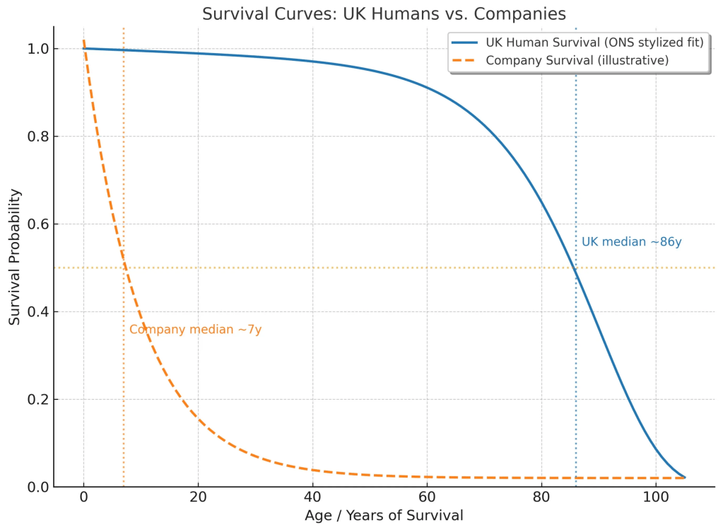 我对公司长期存在的困惑主要来自实证数据。根据OECD的统计,约40%–60%的新创企业在成立后3–5年内退出市场,且这一现象在不同国家间差异不大。美国小企业管理局(SBA, US Small Business Administration)提供了类似数据:约20%的新创公司在第一年失败;约50%在五年内失败;约70%在十年内失败(换言之,仅有约30%的公司能存活10年以上)。德国基于Fritsch数据的研究发现企业寿命的中位数约为10年;而瑞典的一项研究跟踪了1990年代成立的一批公司,发现14年后仅有8%仍在运营。