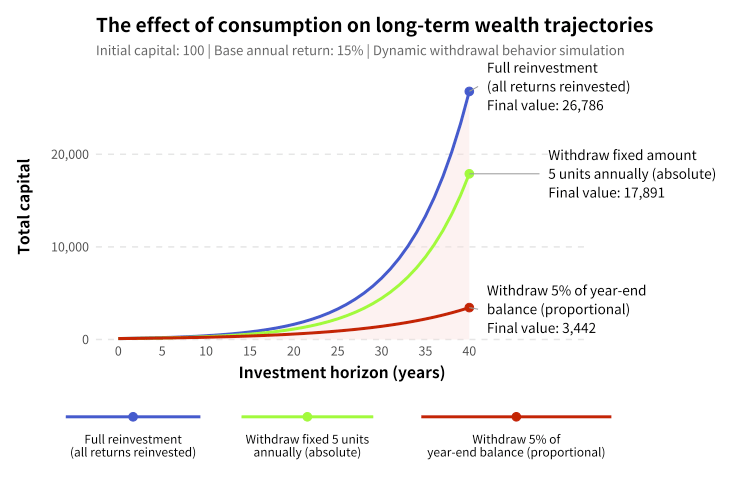 A simple comparison may help. As shown in the figure below, with initial capital 100, nominal annual return 15%, and investment horizon 40 years, different withdrawal rules produce markedly different wealth trajectories. If all returns are reinvested, capital compounds at 15% and the terminal value is about 26,786. If each year you first grow by 15% and then withdraw 5% of the year-end total, the terminal value is only about 3,442. If each year you grow first and then withdraw a fixed 5 units of cash, the terminal value is only 17,891. The results show that under the same nominal return, withdrawal rules and consumption paths have a very large effect on long-term capital accumulation. Whether capital is “interrupted” by continuous consumption and the specific form of that interruption often matters far more than differences of a few percentage points in returns.